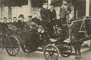 ↑ 1905년 11월17일 오후 을사조약을 강제로 체결하기 위해 이토 히로부미와 하세가와 요시미치 사령관(마차에 앉은 왼쪽과 오른쪽 사람)이 경운궁 수옥헌으로 향하고 있다. 훗날 경운궁은 덕수궁으로, 수옥헌은 중명전으로 이름이 바뀐다. |
