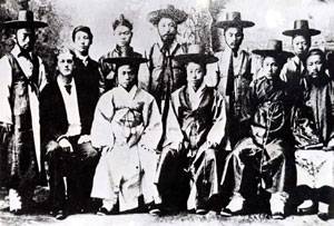 ↑ 1883년 미국을 방문한 조미수호통상사절단. 통역관 로웰, 부사 홍영식, 정사 민영익, 서광범(앞줄 왼쪽부터). |