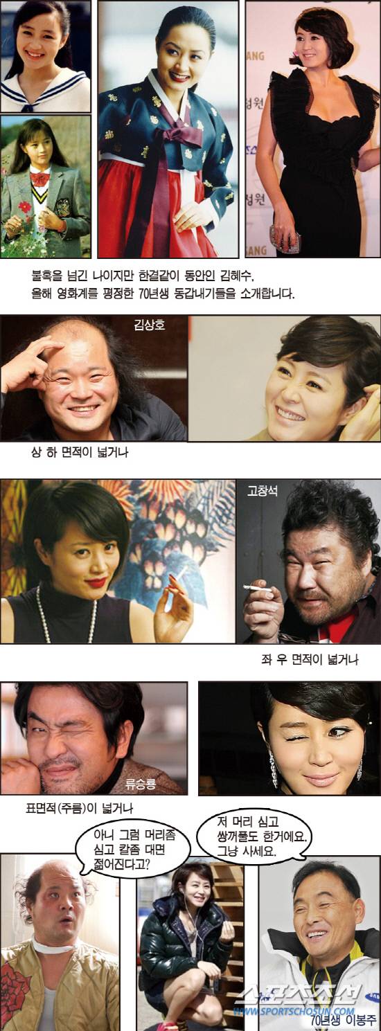 아역 탤런트 출신인 김혜수는 '불혹'을 넘긴 나이라고는 믿기 어려울 만큼 한결같은 모습을 지켜왔다. 이어 올해는 배우로서 청룡영화상 여우주연상 후보에도 당당히 이름을 올렸다. 올 한해 영화계는 '70년생' 배우들의 전성기라 할 만큼 고창석, 류승룡, 김상호, 황정민 등 김혜수와 동갑내기 배우들의 활약이 눈부셨다. 나이는 같지만, 분위기는 사뭇 다른 김혜수와 동갑내기 배우들의 얼굴을 분석해 동안과 노안의 지극히 비과학적인 차이점을 알아냈다. 그것은 바로 '얼굴의 면적'이었는데, 노안과 얼굴 크기의 절대적인 상관관계를 파헤친다. 엔터테인먼트 팀 deer@sportschosun.com 사진출처: 영화스틸 스포츠조선 DB
