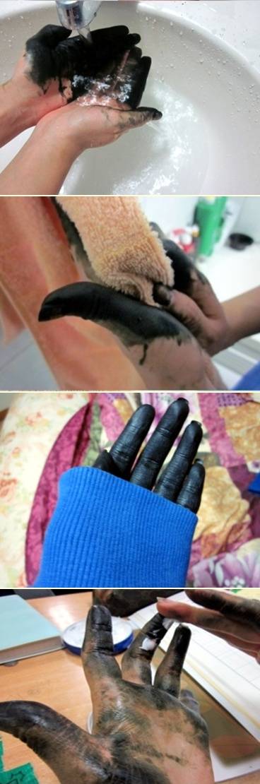 그 후 작성자는 검은 물이 많이 빠진 손 사진과 함께 후기를 올렸다. "어제 저녁에 전용 리무버로 닦았을 땐 별 효과가 없었는데 리무버 솜을 자기 전까지 꽉 쥐고 비비고 꽉 쥐고 비비고를 4, 5번 했더니 많이 지워졌다"며 일상생활 하는 모습이 담긴 사진을 첨부했다.