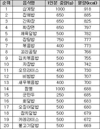 조사 결과 1인분을 기준으로 할 때 삼계탕이 918kcal로 열량이 가장 높은 것으로 나타났다. 잡채밥은 885kcal, 간짜장은 825kcal, 짜장면은 797kcal로 뒤를 이었다.