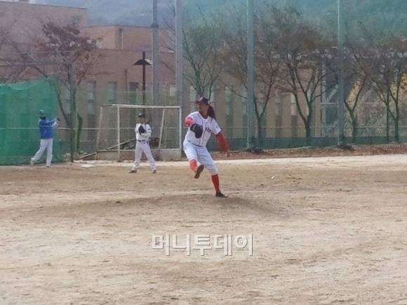 ↑ 지난 19일 서울대에서 야구부와의 친선시합에 '야생마' 이상훈 선수가 공을 던지고 있다.ⓒ송학주 |