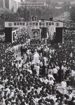 ↑ 1987년 6월 민주항쟁 도중 최루탄을 맞아 숨진 고(故) 이한열씨 영결식. |