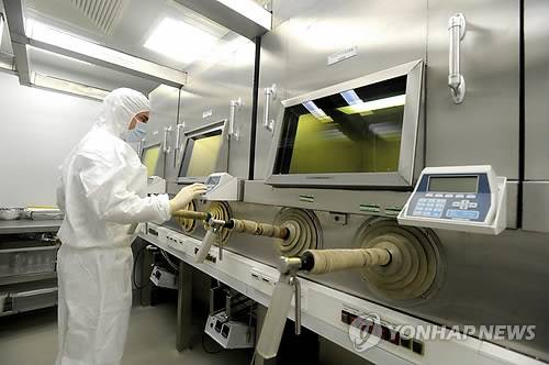 epa03015573 An expert works on the production of radioactive medicines in a laboratory of the Isotope Institute in Csilleberc, in the Budapest hills, Hungary 25 November 2011. A higher-than-usual amount of iodine 131 isotope has been released through the chimney of the isotope plant of Csilleberc in the Budapest hills over the previous few months. The Sustainable Development Committee of the Hungarian Parliament is scheduled to assess the causes of higher iodine concentration reported from the Czech Republic and other parts of Europe. EPA/IMRE FOLDI < 연합뉴스 모바일앱 다운받기 >< 포토 매거진 >< 저작권자(c)연합뉴스. 무단전재-재배포금지. >
