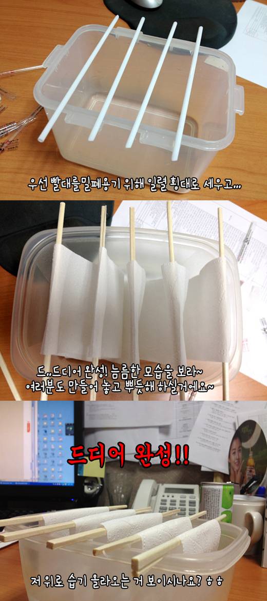이 네티즌이 공개한 초간단 가습기는 밀폐용기, 나무젓가락, 휴지, 물만 있으면 만들 수 있다. 우선 밀폐용기에 나무젓가락을 올려놓고 휴지를 걸어둔다.