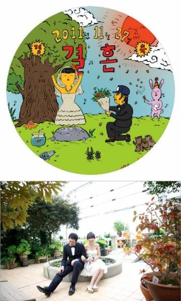 또한 이말년이 공개한 일러스트에는 동산에서 신부에게 꽃다발을 건네는 이말년의 모습이 담겨있으며 나무와 토끼, 햇님, 다람쥐 등이 축복하고 있는 모습이다.