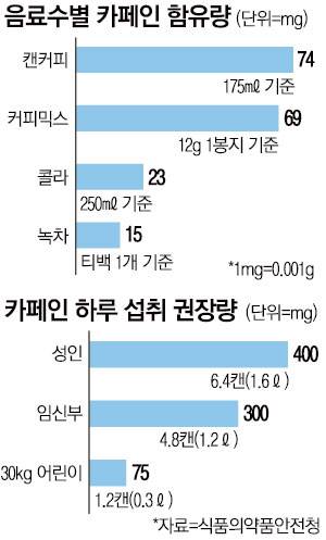 ◆대학생 절반이 카페인 금단증상 호소일상적으로 섭취하는 여러 음료에 카페인이 함유돼 있다. 캔커피(카페인 함유량 74㎎) 커피믹스(69㎎) 콜라(23㎎) 녹차(15㎎ㆍ티백 1개 기준) 박카스(30㎎ 1병 기준) 등에 카페인이 들어 있으며, 에너지음료 중 일부 제품의 카페인 함량은 1캔당 164㎎이나 된다. 임신부가 이런 에너지음료를 2캔 이상 마시면 하루 섭취 권장량을 초과하게 된다.