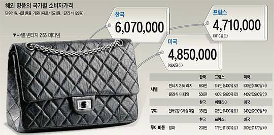 샤넬의 인기 핸드백 '빈티지 라지'의 한국 내 가격도 663만원인데 프랑스에선 517만원, 미국은 530만원 선이었다.
