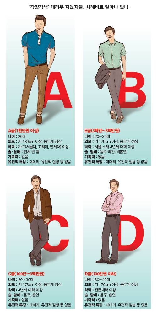 기자가 대리부 지원자들을 분석해본 결과 크게 A, B, C, D 등급으로 분류되고 있었다. A급은 최상위급이다. 나이가 20~30대 초반이어야 하고, 외모는 준수한 편이어야 하며, 키는 1백80cm 이상은 되어야 한다. 학력은 일명 SKY로 불리는 명문대 출신이어야 한다. 물론 술·담배는 하지 않아야 한다. 유전적인 질병도 없어야 한다. 사례비는 1천만원 이상이라고 알려졌으나, 협상하기에 따라 더 높게 정해질 수 있다.