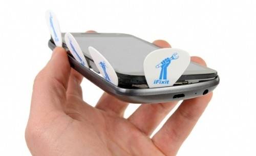 전용 플라스틱 툴로 프레임을 벗겨내고 있다. 기타 피크로도 열 수 있다고 한다. 메인보드 등 주요 부품이 온전한 모습을 드러내기 시작했다.