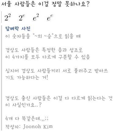 12일 국내 주요 커뮤니티사이트에서는 '서울 사람들은 이걸 정말 못하나요?'라는 제목과 함께 적힌 '2^2(2의 2승)', '2^e', 'e^2', 'e^e' 네 개의 숫자가 네티즌들의 관심을 끌었다.