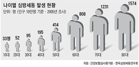 대한심장학회 부정맥연구회 조사를 따르면 대표적인 부정맥인 심방세동 환자는 40대에 인구 10만명 기준으로 195명 생긴다. 그러다 60대가 되면 808명(4배), 70대에는 1231명(6배)으로 뛴다. 40~50대의 부정맥은 과음과 흡연, 스트레스가 주요 원인이다. 현재 부정맥은 65세 이상에서 3~5%, 80세 이상에서 10%가량 발견된다. 부정맥에 대한 인식이 낮아 진단받지 않고 지내는 수를 감안하면 국내에 최대 100만명의 잠재 환자가 있을 것으로 심장학회는 보고 있다. 고령인구에서는 발생률이 치매를 앞지른다. 남성에서 발병 위험률이 암 발생 1위인 위암보다 10배가량 크고, 여성에서는 유방암보다 보다 8배 높다.