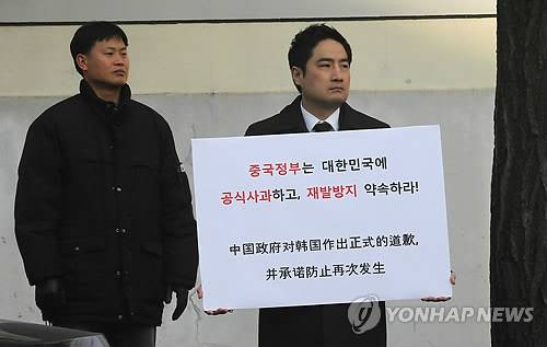 (서울=연합뉴스) 박지호 기자 = 13일 오후 서울 종로구 효자동 중국대사관 앞에서 무소속 강용석 의원이 중국정부의 사과와 재발방지를 요구하며 1인시위를 하고 있다. 2011.12.13