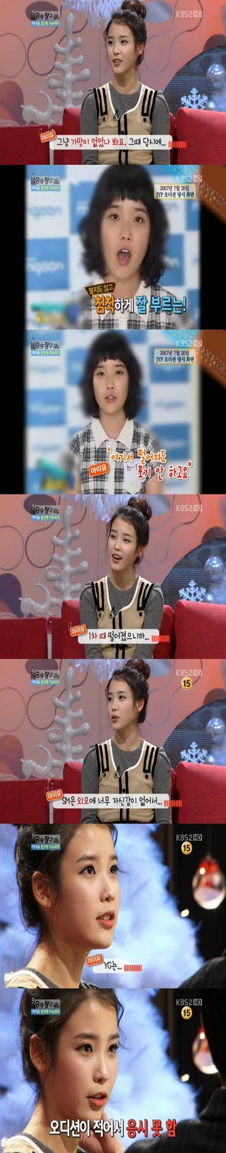 아이유는 "떨어뜨리는 것은 얘기를 안해줬다. 그때 당시에는 가망이 없었나보다"며 "3대 기획사 중엔 JYP에 떨어졌었다"고 고백했다.