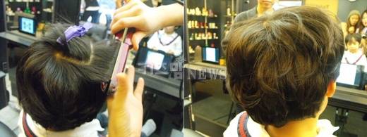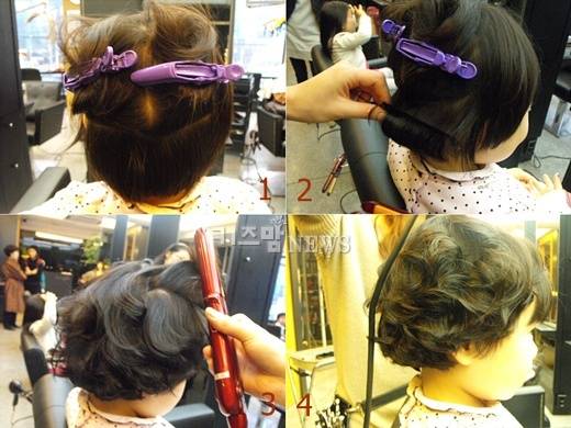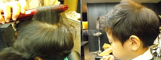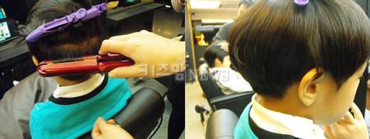 우선 섹션을 넓게 나눈 뒤 머리카락이 흘러내리지 않도록 핀으로 고정시킨다. 아이 머리카락이 짧기 때문에 '볼륨 매직기'로 스타일링 하는 것이 좋다.