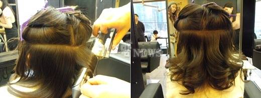 안쪽은 머리카락이 짧기 때문에 웨이브 넣기가 힘들다. 때문에 머리카락을 동그랗게 앞쪽으로 말아 C컬을 만들어준다. 반면 머리카락이 긴 바깥머리는 볼륨 매직기로 머리 끝선까지 말아 S컬을 만들어준다. 이때 웨이브 방향은 상관없다.