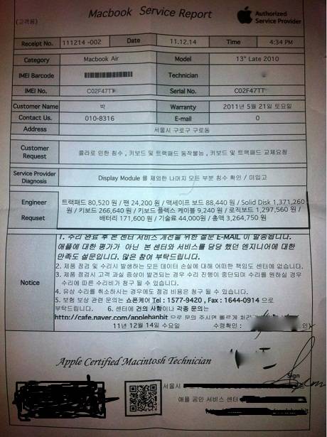 이 제품의 수리비는 자그마치 326만4750원이다. 해당 모델(13인치 Late 2010)의 신품 가격 160만원의 배가 넘는 셈이다.