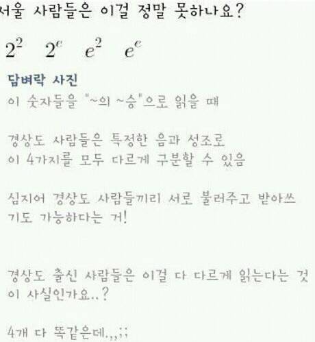 지난 12일 누리꾼 김 모씨가 올린 "서울 사람들은 이걸 정말 못하나요?"란 제목의 게시글이 발단이 됐다. 김씨는 2², e² 등의 숫자 4가지를 제시하며 "경상도 사람들은 특정한 음과 성조로 이 4가지를 다르게 구분할 수 있다"고 올렸다.
