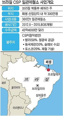 16일 건설업계에 따르면 포스코건설은 이날 오후(현지시간) 리우데자네이루에 있는 브라질 최대 철광석 공급 회사인 발리(Vale) 본사에서 동국제강·포스코·발리의 합작법인 CSP와 일관제철소 건설 계약을 체결했다. 이 사업은 브라질 북동부 세아라주 페셍 산업단지에 2015년까지 연간 300만t의 제품을 생산하는 일관제철소를 짓는 공사다. 포스코건설이 설계·구매·시공·시운전에 이르는 EPC 사업 전 과정을 일괄 수행한다.