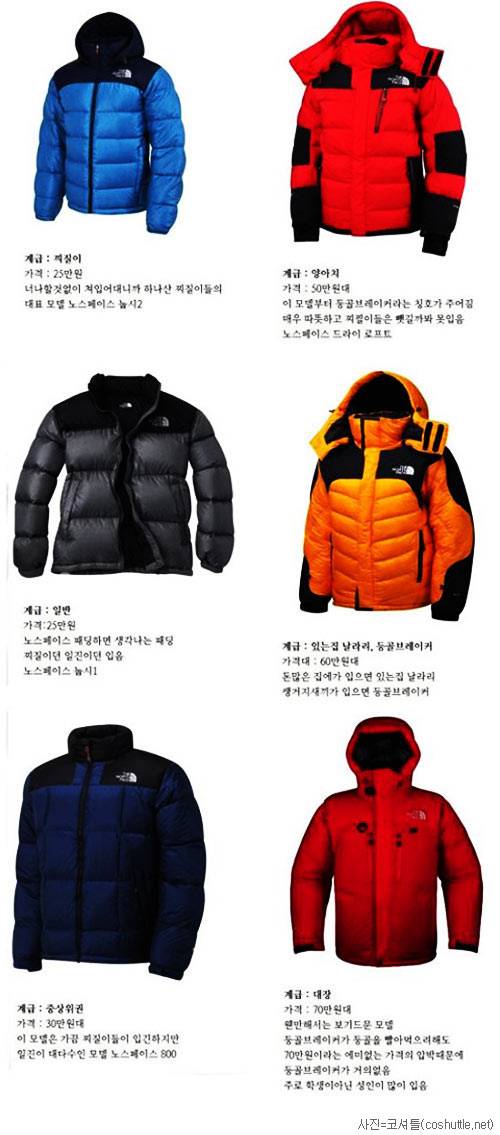 18일 인터넷 포털 및 커뮤니티 사이트에는 패딩 가격별로 여섯 분류로 나눈 '노스페이스 계급도'가 빠른 속도로 확산되고 있다. 계급도는 한 고등학교 재학생이 제작했다.