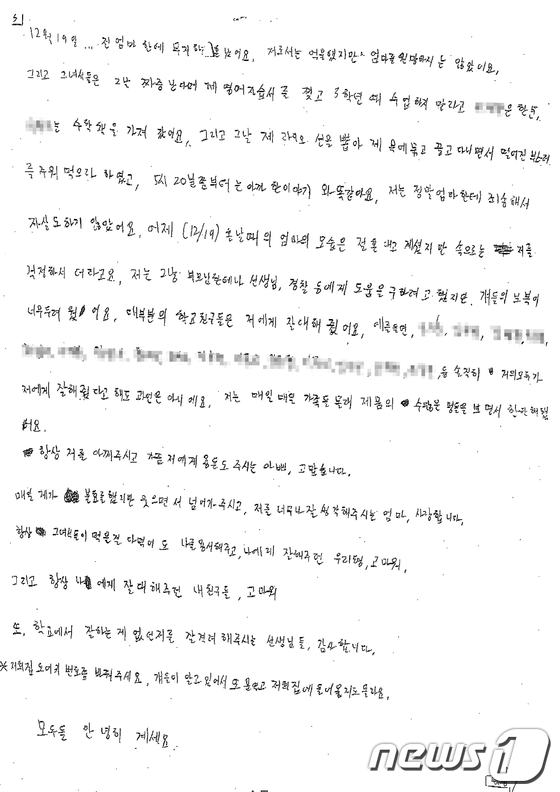 같은 반 학생에게 괴롭힘을 당해 자살한 대구 한 중학교 학생의 유서1 News1 |