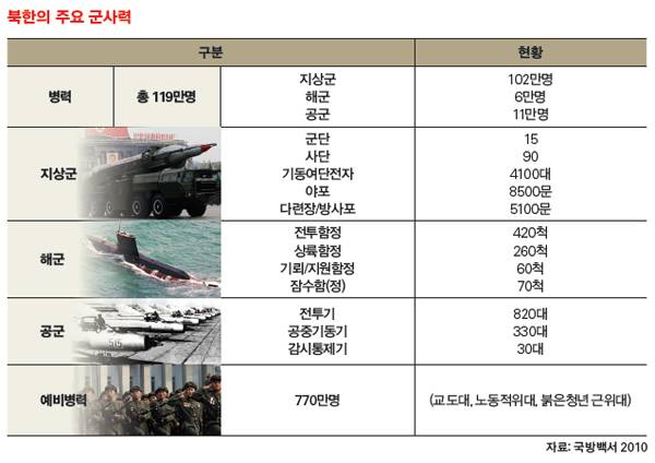 북한 체제의 가장 큰 버팀목인 '조선인민군대'의 무장력은 어느 정도일까? 일반적으로 재래식 무기를 기본으로 할 때 북한 인민군은 크게 전차, 야포, 다연장·방사포 및 미사일이 한국군보다 숫자 면에서 월등히 많은 것으로 나타나 있다. 특히 미사일 지도국 및 화생방 무기 그리고 핵무장 능력은 우리와 비교할 수 없는 비대칭 전력이다. 가히 전의를 상실할 정도로 위협적이라고 말할 수 있겠다.