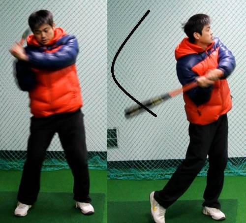 오른 타자의 경우 오른 팔꿈치가 겨드랑이가 아닌 가슴 쪽에 붙인다는 느낌으로 스윙이 이뤄져야 한다. 오른 팔꿈치가 왼 팔꿈치를 따라간다는 느낌이다.(그림1 참조) 팔꿈치가 겨드랑이에 붙어 나오게 될 경우 스윙이 뒤에서 퍼지기 때문에 몸쪽 공을 맞출 수 폭이 있는 적어진다. 몸쪽 공 공략이 더욱 어려워진다는 얘기다.(그림2 참조)