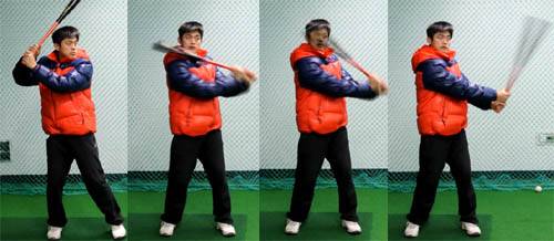 배트를 최대한 세워서 치는 것도 방법이다. 타격자세에서 방망이가 공을 맞는 지점까지 최대한 단거리로 방망이를 세워서, 찍어내린다는 느낌으로 치는 것이 좋다.(그림3 참조)