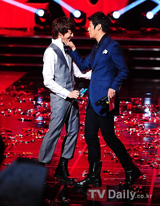 이날 '뮤직온탑' 1위의 영광을 차지한 트러블메이커 앵콜무대에 오른 비스트 윤두준과 이현우가 함께 공연을 하고있다.