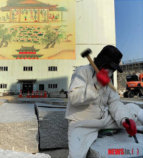 【서울=뉴시스】박종민 기자 = 문화재수리 장인들의 임금 단가 문제로 한 달여간 중단됐던 숭례문 복원 목공사가 재개된 10일 서울 숭례문 복구현장에서 한 석공이 돌을 다듬고 있다. 문화재청은 시공사인 명헌건설과 실제 복원을 맡은 신응수 대목장이 의견 조율을 통해 아무런 조건 없이 기존 계약대로 공사를 다시 하기로 했다고 밝혔다.