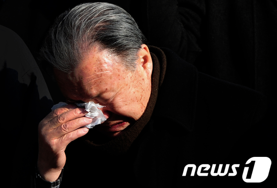 14일 오후 서울 갈월동 옛 남영동 대공분실(현 경찰청인권보호센터) 마당에서 열린 '고 박종철 열사 25주기 추도식'에서 고인의 부친 박정기 씨가 눈물을 훔치고 있다.