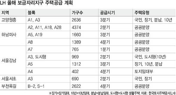 보금자리주택 사업지구 대부분을 맡고 있는 엘에이치는 경기 고양원흥(2636가구)과 하남미사(7423가구), 서울 강남(3448가구)과 서초(690가구), 경기 부천옥길(2622가구)에서 모두 1만6819가구를 공급한다. 하남미사와 부천옥길에서는 분양주택만 공급되지만 다른 곳에서는 임대주택이 많이 나오는 게 특징이다.
