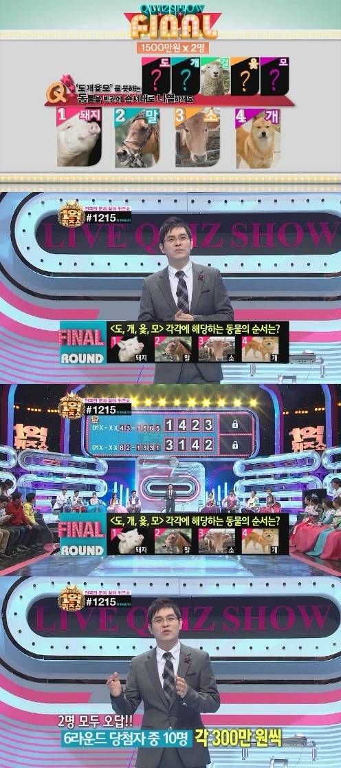 걸은 양이고 나머지 돼지 말 소 개를 순서대로 맞춰야 하는 것. 최종 문제는 6라운드 정답자 중 2명을 컴퓨터로 선정해 전화연결을 한 뒤 대결을 펼치는 구도다.