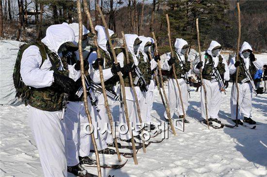 30㎏의 군장을 메고 완전무장 상태에서 고로쇠 전술스키나 알파인 스키를 이용해 달리는 전술 기동훈련도 이뤄졌다. 길이가 짧고 끈만 묶으면 전투화에 착용이 가능한 고로쇠 전술스키는 험준한 산악지형에서도 사용이 가능하고 방향전환도 빨라 특전사 임무수행에 주로 사용된다.