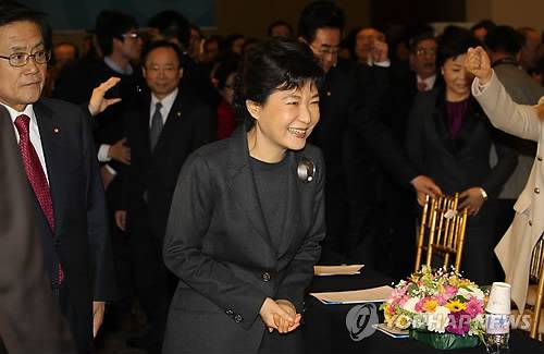 (서울=연합뉴스) 김현태 기자 = 박근혜 한나라당 비상대책위원장이 30일 오후 서울 영등포구 당산동 그랜드 컨벤션 센터에서 열린 중앙위원회 신년하례회에서 행사장으로 들어오고 있다. 2012.1.30