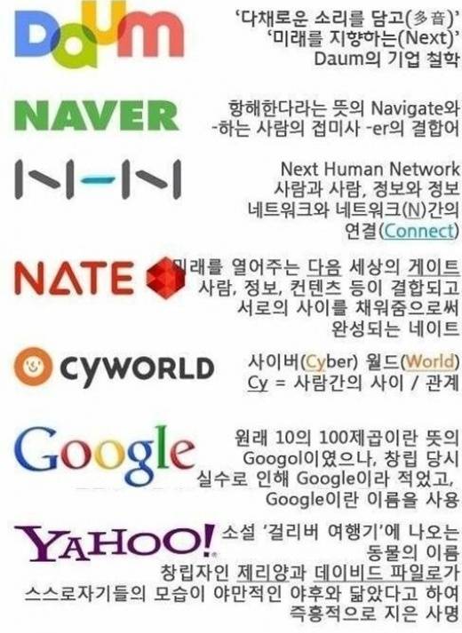 포털 이름은 대부분 '관계', '연결', '미래지향'적인 의미를 포함한다.부동의 국내 1위 포털사이트 네이버는 '항해한다'는 뜻의 '내비게이트(navigate)와 '~하는 사람'이라는 의미의 접미사 '~er'을 결합한 단어다. 풀이하자면 '온라인 세상을 탐험하는 사람'이라는 의미가 된다. 모회사인 NHN은 넥스트 휴먼 네트워크(next human network)로 사람과 사람과 정보, 네트워크를 연결한다는 의미다. 로고 가운데 '연결'을 의미하는 푸른 선이 인상적이다.