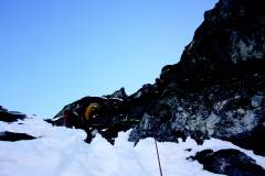 ↑ [월간산]파릴랍차 북벽 등반. 대원들이 오버행 침니로 접어들고 있다. |