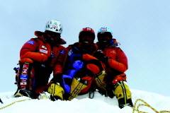 ↑ [월간산]스팬틱 정상에 오른 민준영·김팔봉대원과 김형일 대장(왼쪽부터). 민준영 대원은 2009년 9월 히운춘리(6,441m) 북벽에서, 김형일 대장은 2011년 11월 촐라체(6,440m) 북벽 등반 중 사고를 당했다. |