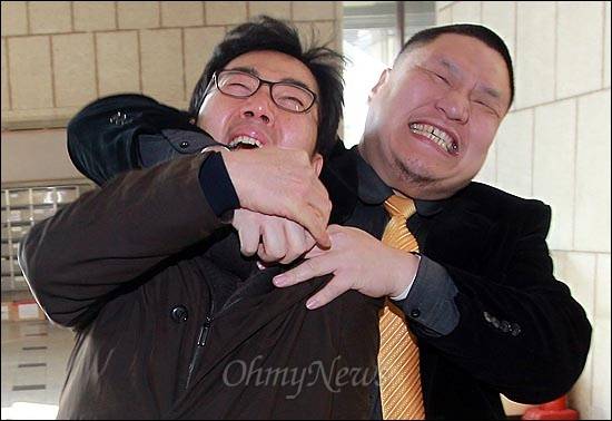 프로레슬러 김남훈씨가 2일 오후 서울 종로구 프레스센터 언론노조 사무실 한편에 마련된 < 뉴스타파 > 회의실에 기습으로 난입했다.