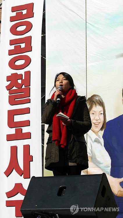 (서울=연합뉴스) 윤태현 기자 = 4일 오후 서울 서대문구 북가좌동 서울역광장에서 열린 KTX 민영화 저지결의대회에서 '고대녀'로 알려진 김지윤 전 고려대 문과대 학생회장이 발언하고 있다. 2012.2.4