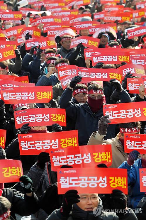 (서울=연합뉴스) 윤태현 기자 = KTX 민영화를 반대하기 위해 전국철도노동조합원들이 4일 오후 서울 서대문구 북가좌동 서울역광장에서 결의대회를 열고 있다. 2012.2.4