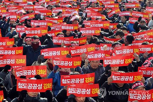 (서울=연합뉴스) 김승욱 기자 = 민주노총 전국철도노동조합은 4일 오후 서울역 광장에서 4천명(경찰 추산)이 모인 가운데 결의대회를 열고 "정부는 KTX 민영화 계획을 당장 폐지하라"고 촉구했다.