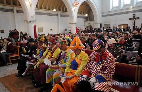epa03093514 Clowns attend a service at the Holy Trinity Church in London, Britain, 05 February 2012. Clowns gathered at the church to attend the 65th annual Joseph Grimaldi memorial service which has been held in the most celebrated English clown's honour since 1946. The unique church service is held on the first Sunday of each February and a wreath is laid in Grimaldi's honour. The renown clown lived from 1778-1837. EPA/FACUNDO ARRIZABALAGA < 연합뉴스 모바일앱 다운받기 >< 포토 매거진 >< 저작권자(c)연합뉴스. 무단전재-재배포금지. >