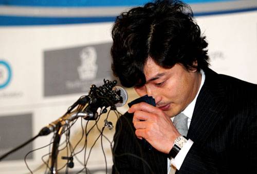1월 31일 반지의 제왕 안정환이 서울 강남구의 한 호텔에서 은퇴를 선언하고 기자회견을 열었다. 기자회견 중 흐르는 눈물을 닦고 있는 안정환 선수. | 이석우 기자 |