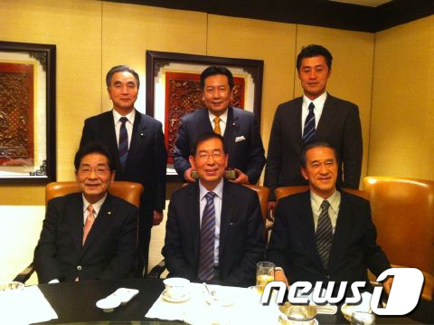 박원순 시장이 9일 일본 정부 대신들과 저녁식사를 함께 한 뒤 기념촬영한 사진을 트위터에 올렸다. News1 |