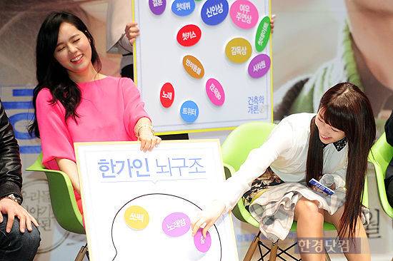 배우 한가인, 수지가 13일 오전 서울 자양동 롯데시네마 건대입구에서 열린 영화 '건축학개론'(감독 이용주, 제작 명필름) 제작보고회에 참석해 뇌구조에 대한 토크를 진행하고 있다.