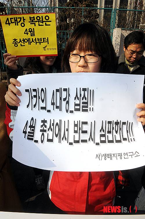【서울=뉴시스】조성봉 기자 = 14일 오전 서울 종로구 정부종합청사 앞에서 열린 '4대강 사업추진, 찬동인사 심판과 재자연화 약속 촉구' 긴급 기자회견에 한 참가자가 손피켓을 들고 4대강 사업을 규탄하고 있다.