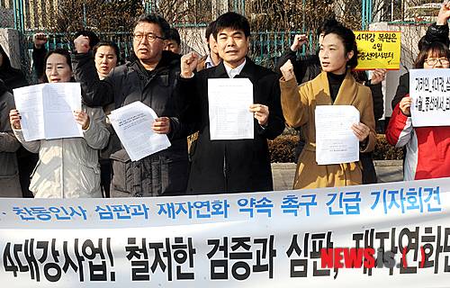 【서울=뉴시스】조성봉 기자 = 14일 오전 서울 종로구 정부종합청사 앞에서 열린 '4대강 사업추진, 찬동인사 심판과 재자연화 약속 촉구' 긴급 기자회견에 참가자들이 구호를 외치고 있다.