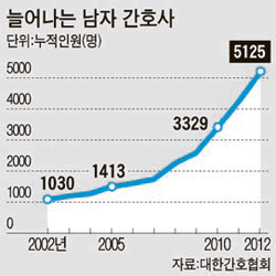 대한간호협회는 올해 남자 959명이 간호사 면허증을 땄다고 14일 밝혔다. 전체 면허취득자의 7.5%에 달한다. 1962년 처음으로 남자 간호사가 배출된 이후 올해 5125명까지 늘어났다. 특히 2007년까지 남자는 한 해 신규 면허취득자의 1~2%에 불과했으나 최근 5년 사이에 급격히 늘고 있다. 51년 문을 연 국군간호사관학교에도 올해 처음으로 남자 8명이 입학했다. 현재 남자 간호사는 전체 간호사 29만5773명의 1.73%를 차지한다. 미국은 6.1%(2008년 기준)다.