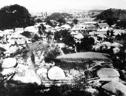 서봉총의 발굴전 모습. 바로 옆에 시천교당이 보인다. 표주박 형태의 무덤이었다.